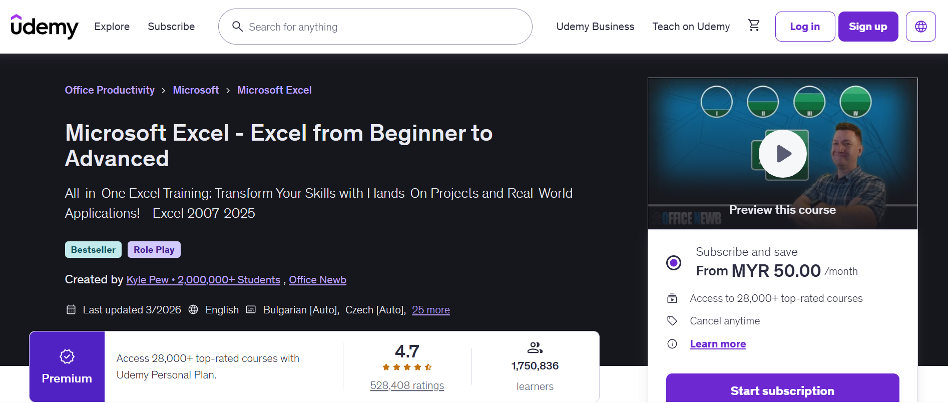 The short answer: Kyle Pew’s “Microsoft Excel – Excel from Beginner to Advanced” on Udemy is one of the platform’s highest-rated Excel courses with over 1.2 million students enrolled and a 4.7-star rating. But, it’s more accurately described as a beginner-to-intermediate course with some advanced topics bolted on. If you already know PivotTables and VLOOKUP, roughly 60% of the content will feel like review. The genuine ROI comes from its later modules on macros, Power Query, and data visualization, sections that can realistically save a competent office worker 3–5 hours per week on reporting tasks once applied.
